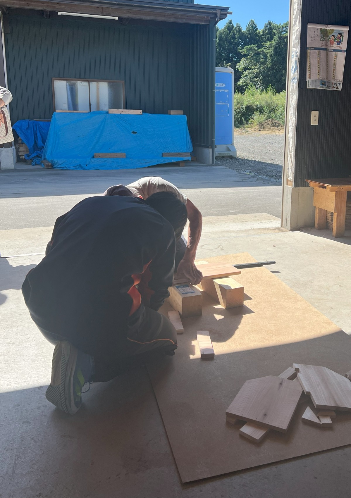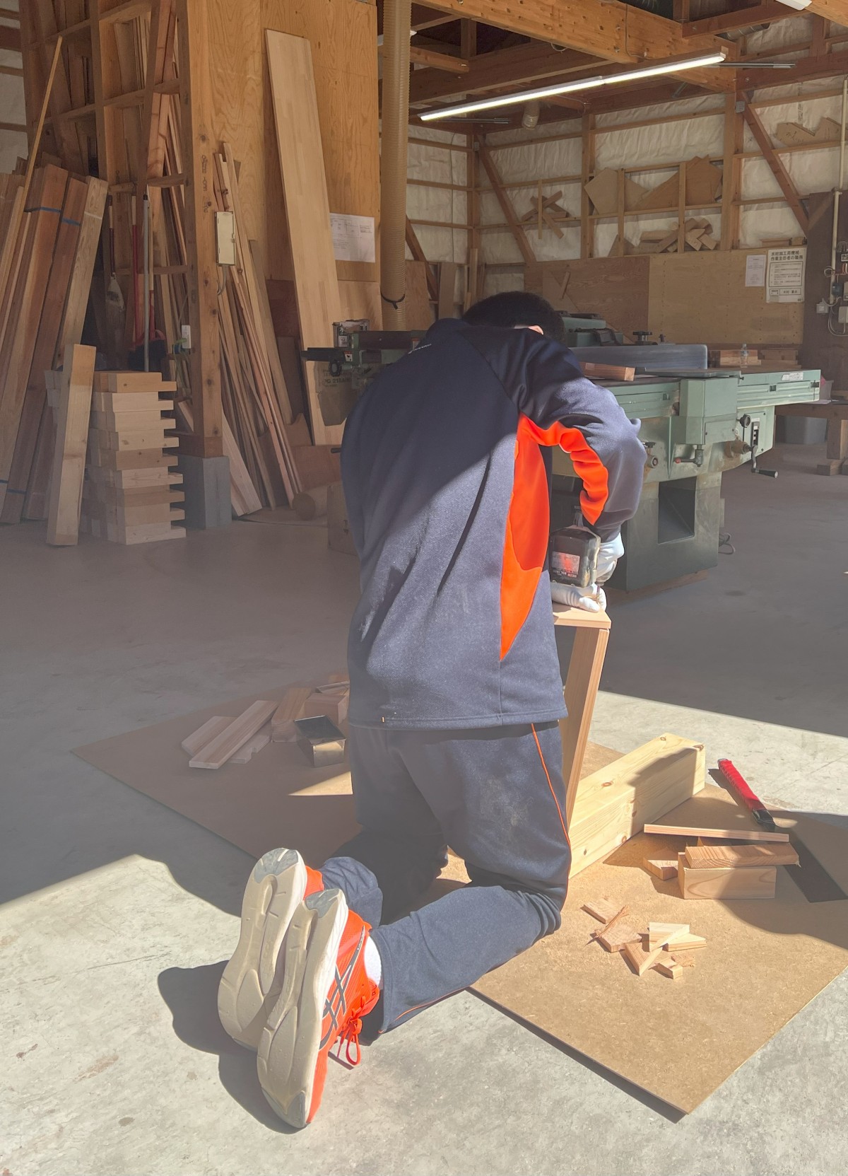 午前中は、現場監督の作成した図面を基に、本棚を作成しました。